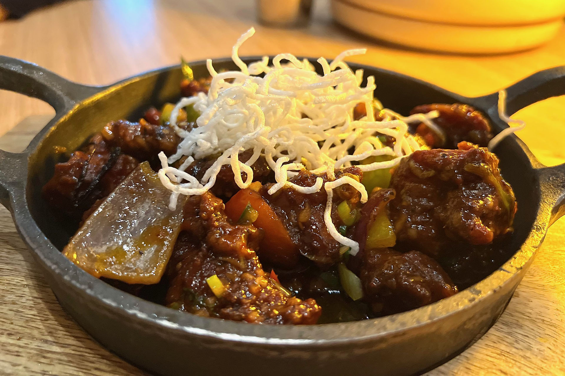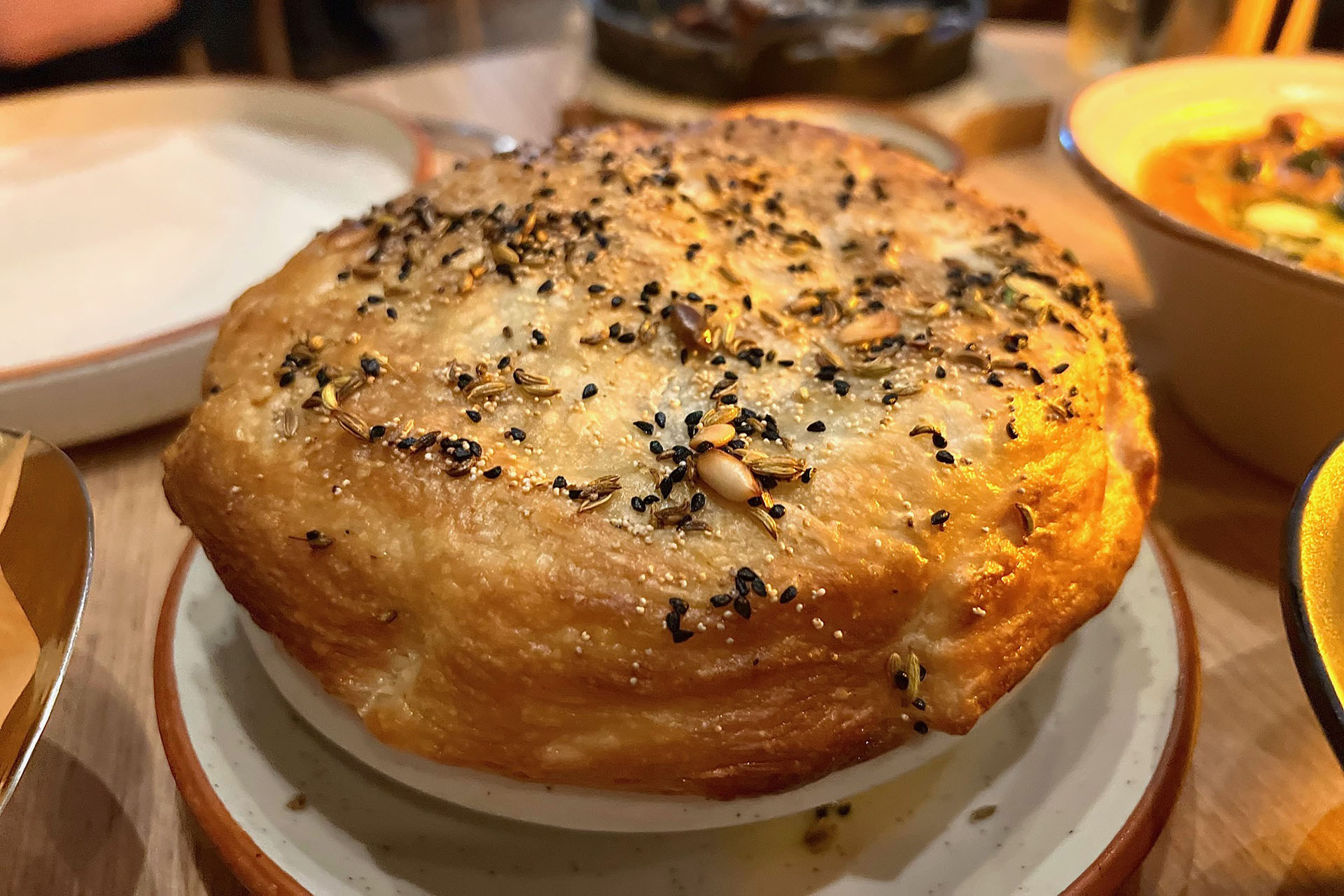 This sumptuous rice dish is aways a special treat and feels almost regal with it’s over the top crisp, puff pastry lid. Part of the fun is digging inside to reveal that puff of steam as you spoon into the flaky long-grain rice, reaching the tender yoghurt-marinated chicken and sweet, caramelised onions. Each component of the biryani works exceedingly well, and this much-beloved dish doesn’t disappoint. It can best be described as elevated comfort food.