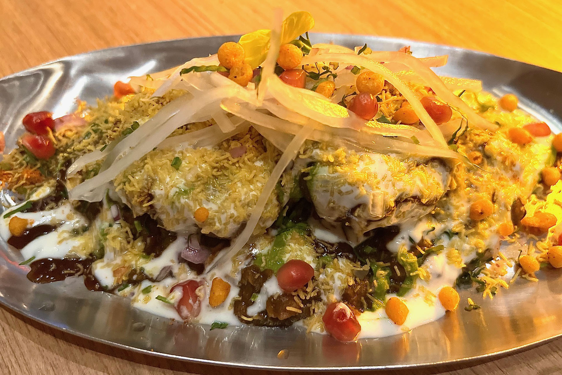 Northern India’s street-style comes alive with this luscious offering: Crispy potato cakes stuffed with aromatic channa dal, topped with chickpeas, fresh yoghurt, masala, tamarind and a sprinkle of mint.