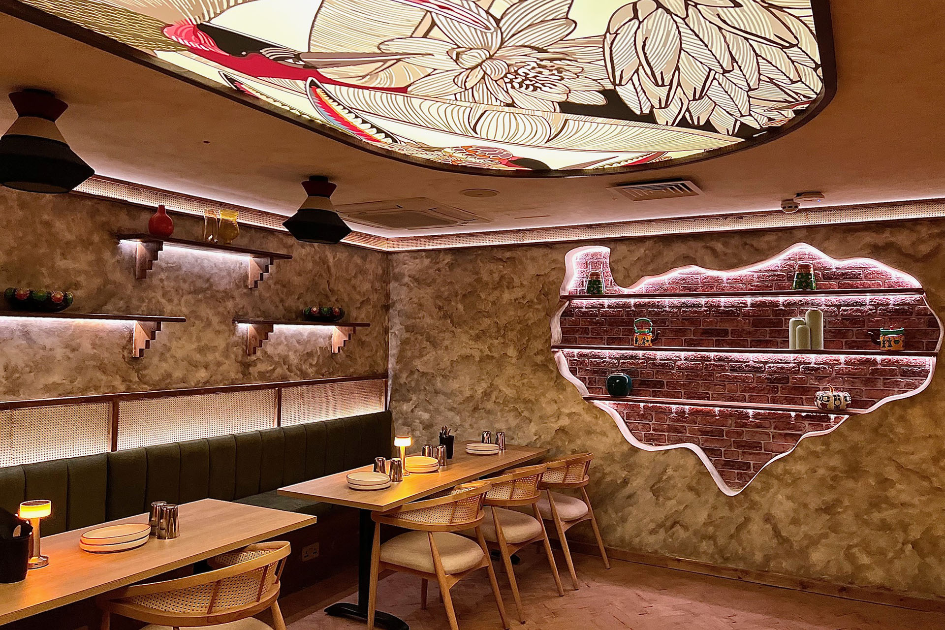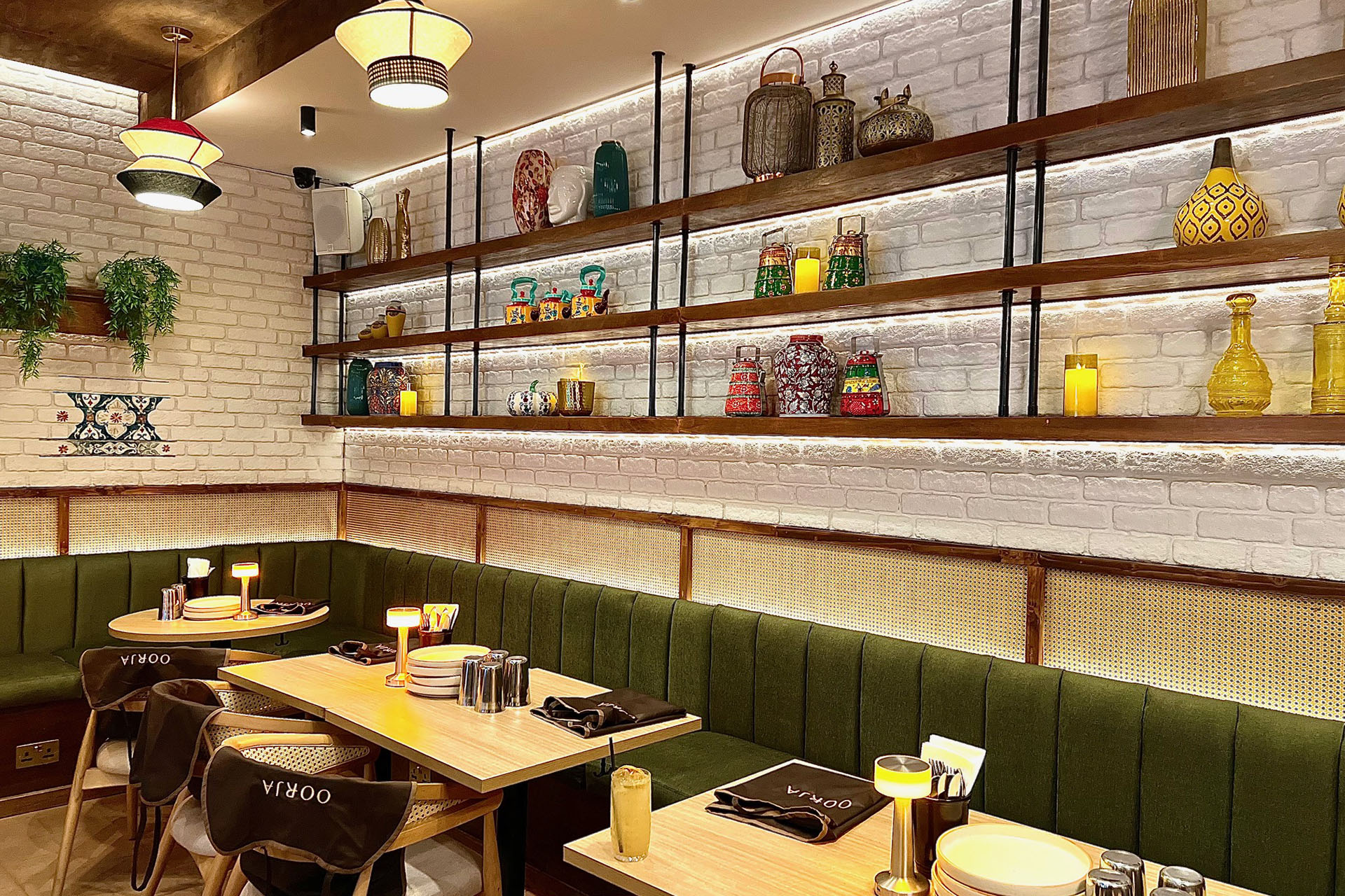 Oorja has additional restaurant space downstairs which reveals a beautifully designed room; and don’t forget to look up at the ornate glass ceiling which is a real wow-factor element of the restaurant. This space would be perfect for large bookings and group events. It even has its very own private bar.