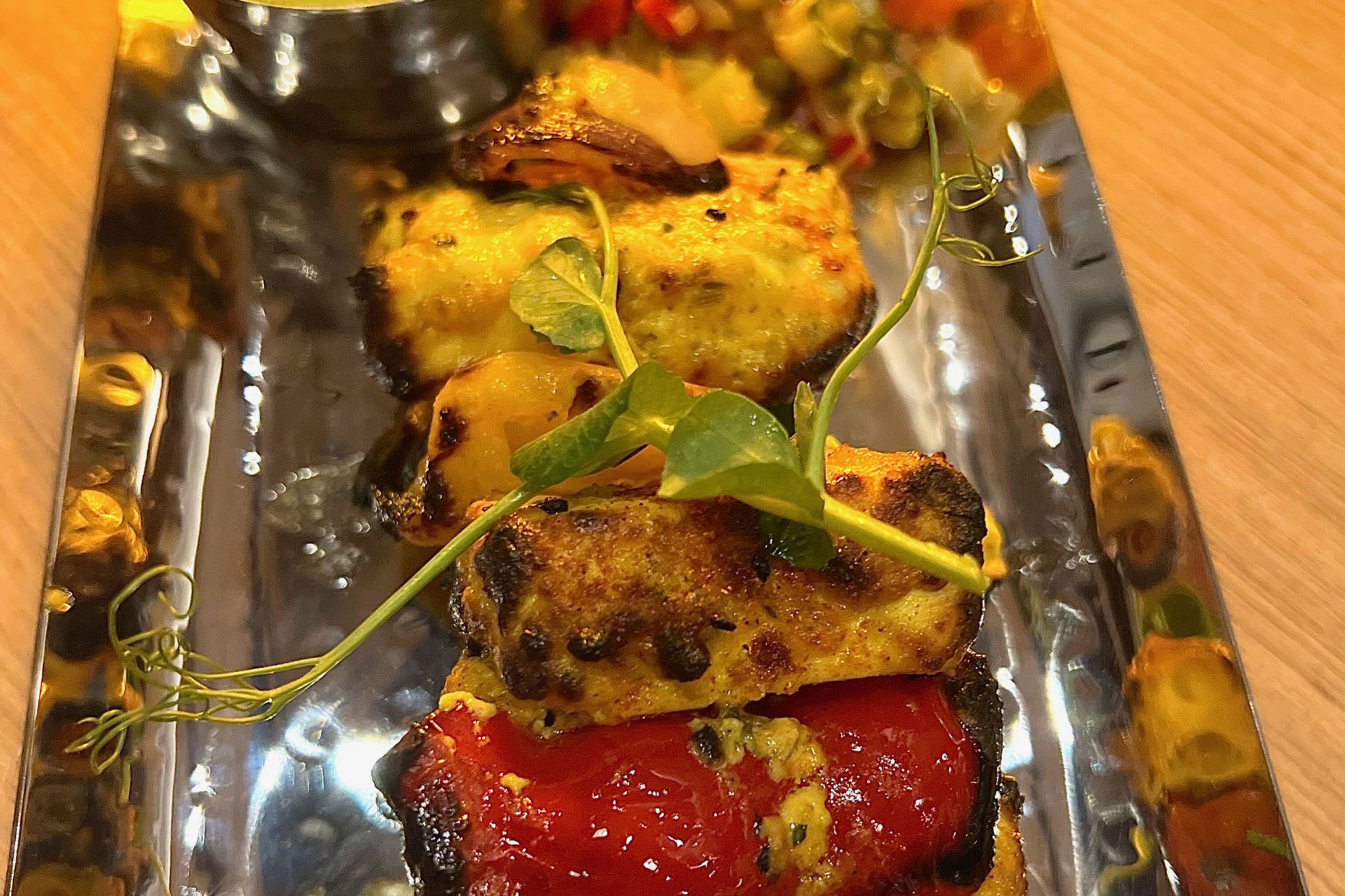 Paneer Tikka, fresh from the tandoor, is a classic traditional dish, and one of our personal favourites. And when the cheese is made fresh (as it is here), there’s nothing quite like it.