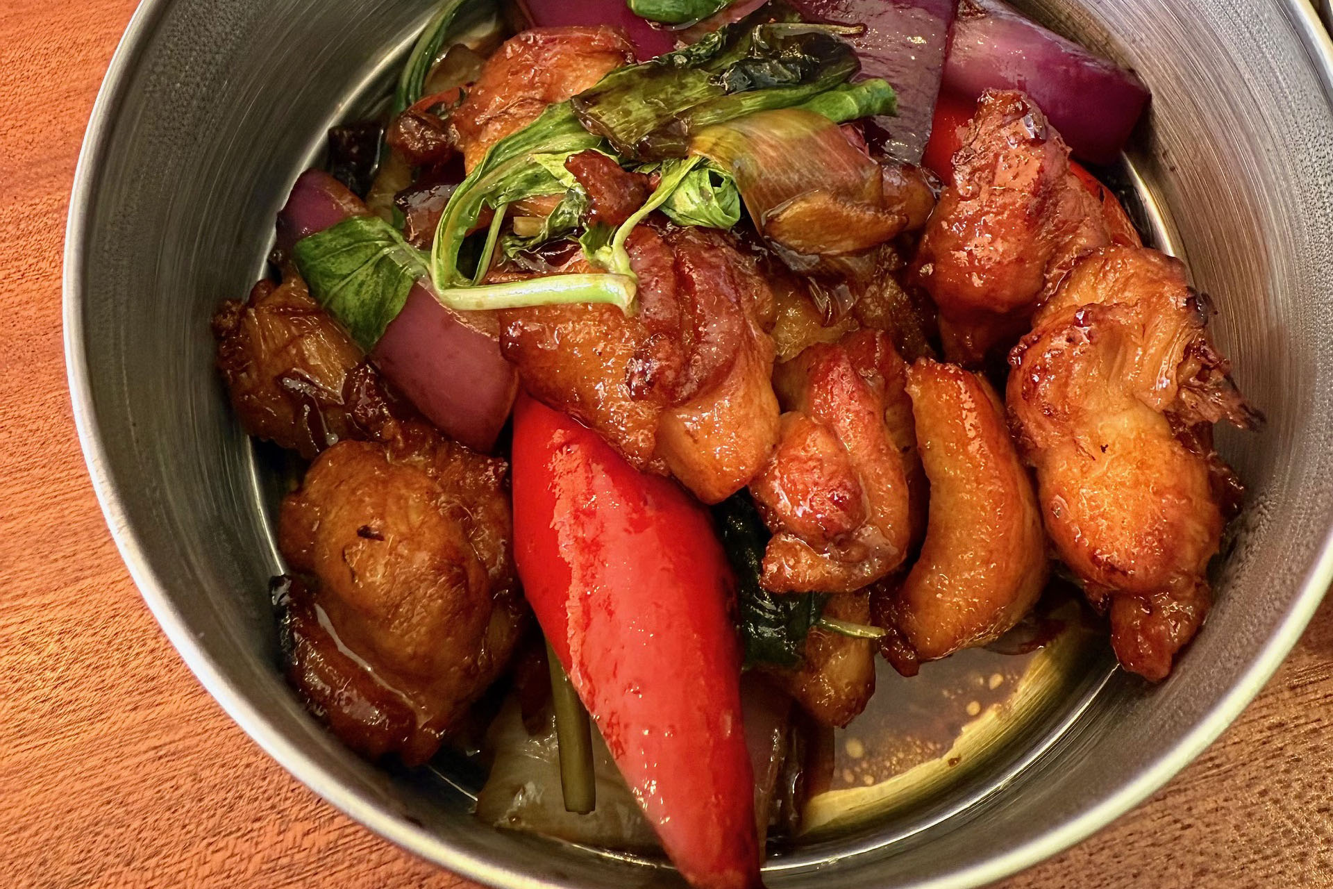 This delicious, Taiwanese chicken dish is the one you’ll be craving long after the lunch is over. The delicate pieces of chicken have been wok-fried to both crispy and juicy perfection, with a mix of aromatic spices, and then simmered in a specific measure of three-cup reduction of rice wine, Tai Hua soy sauce and Chee Seng sesame oil. This dish also has a medley of red onion and peppers, giving plenty of contrasting flavours and textures. This is a standout dish, and one that you’ll be pleased to know you can order on the main menu.