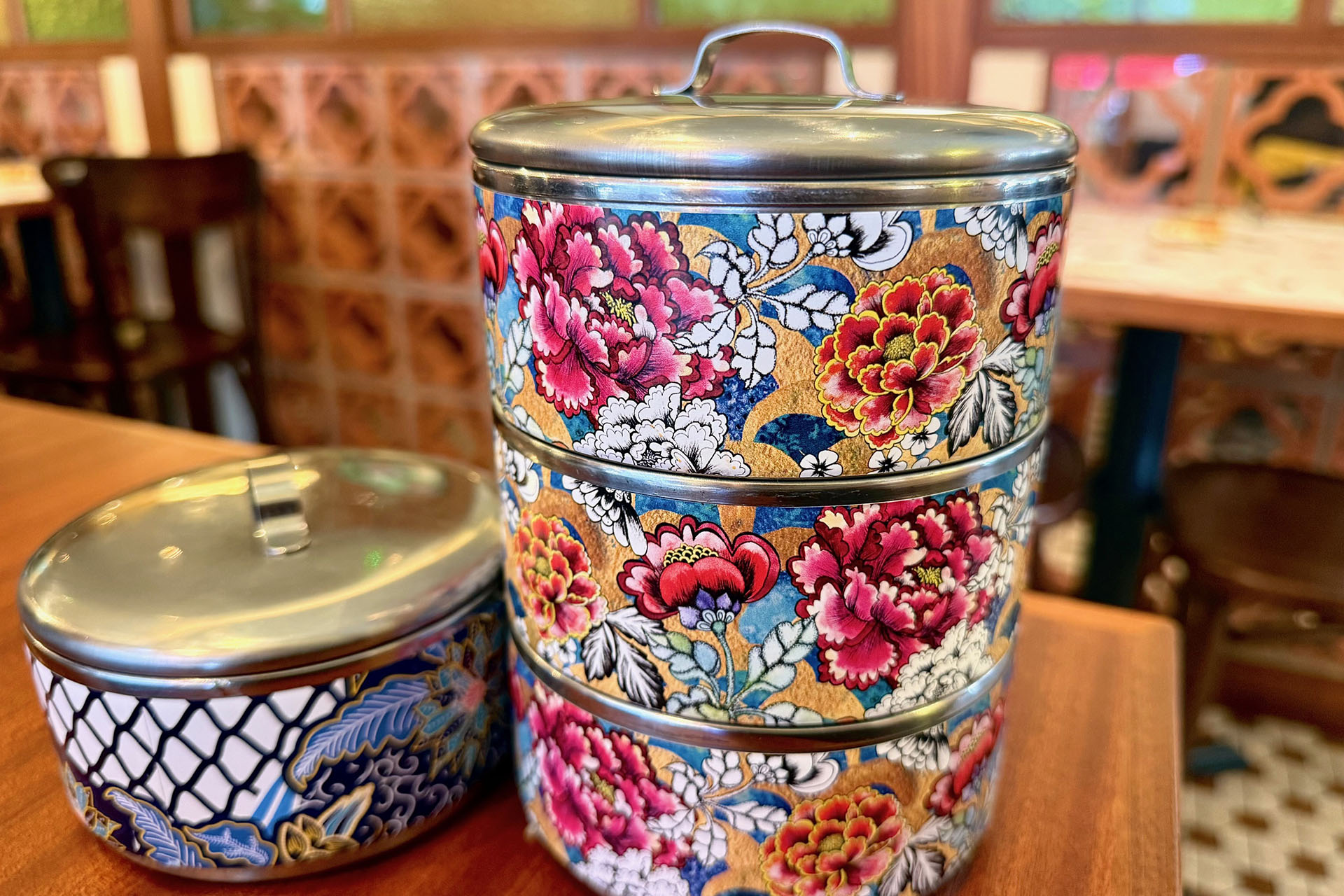 What sets this lunch apart is the exquisite presentation, with each component of the lunch presented in a decorative Tiffin carrier. In essence, it is a stacked lunchbox with different components, typically used for hot food, as it is here. The beautiful presentation instantly turns a simple, fuss-free lunch into a special occasion, and something to be savoured.