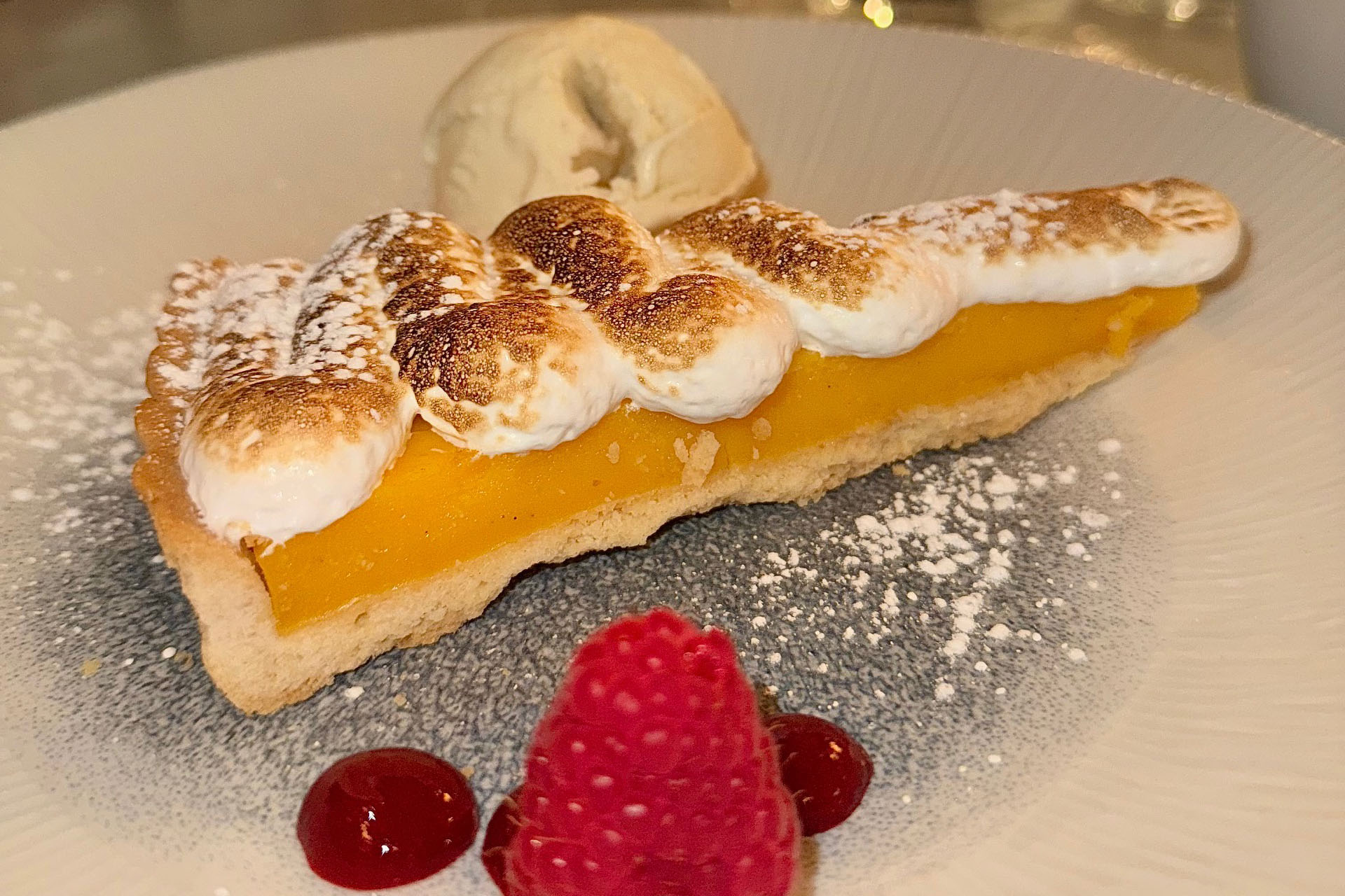 Classic Lemon meringue pie, clotted cream ice cream, raspberries