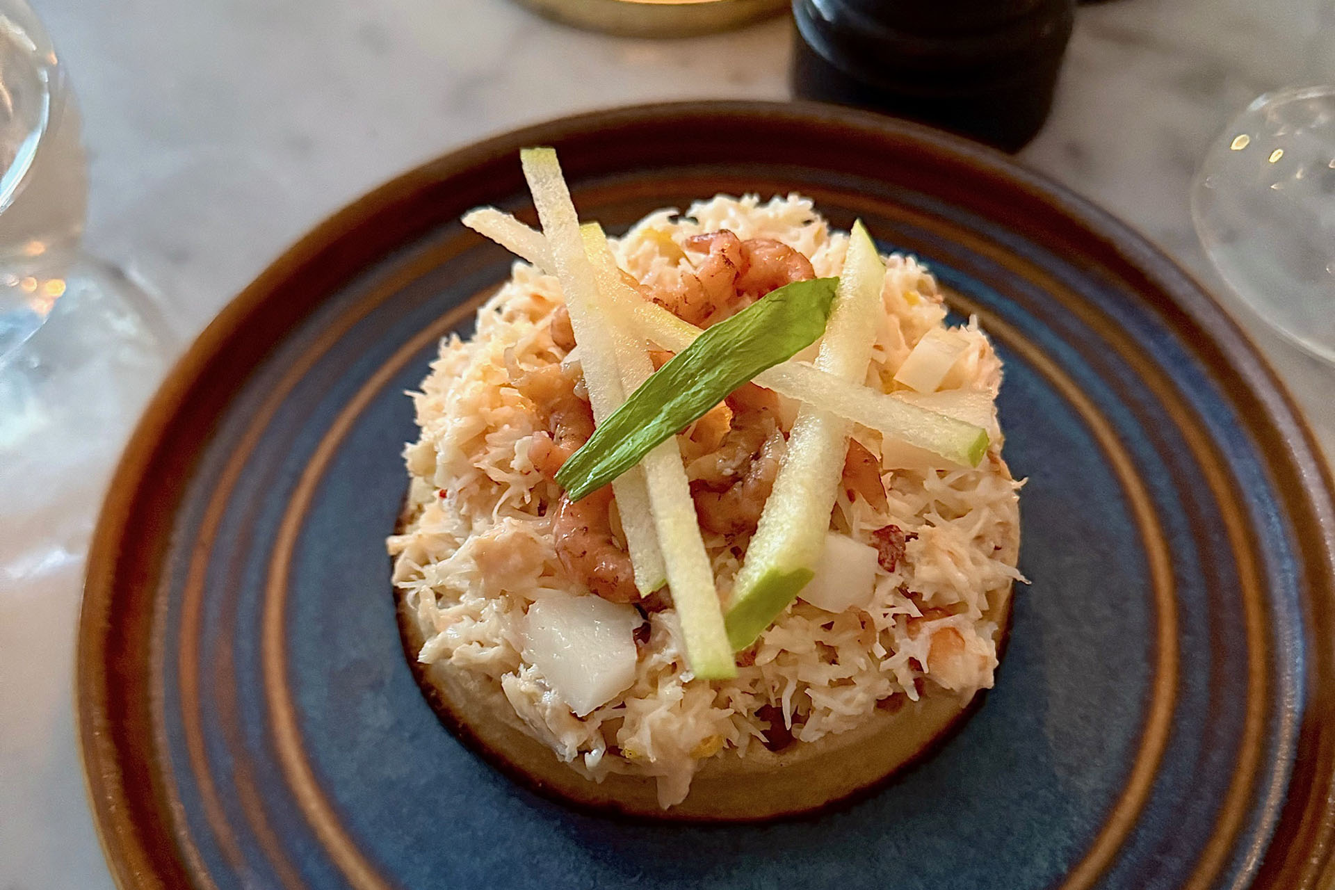 Devon Crab Crumpet, brown shrimp, kohlrabi, apple