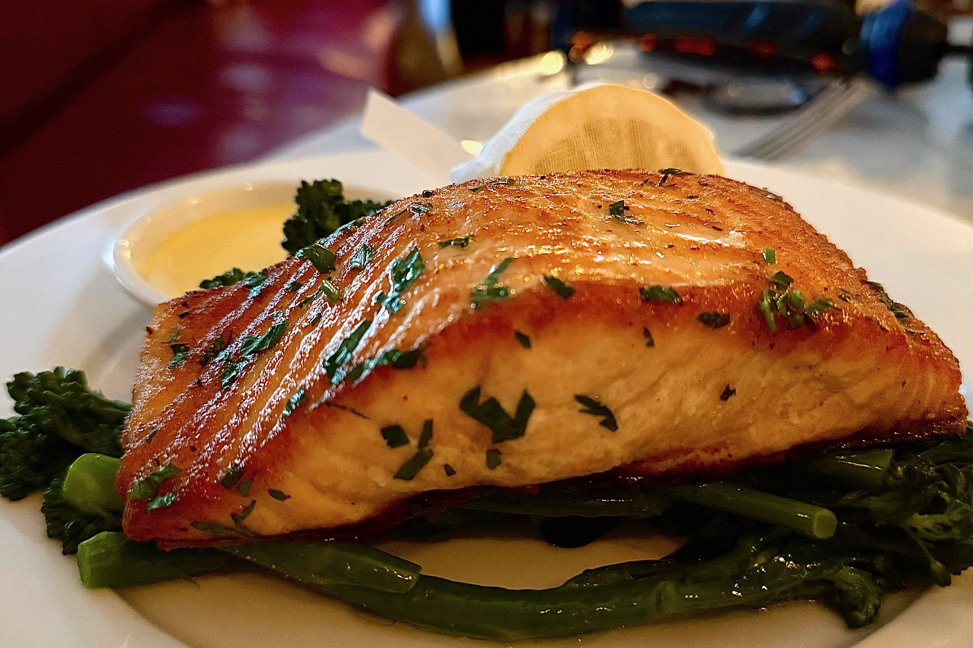 The salmon arrived with a pleasing char on the outside, giving a slight crispiness to the outer texture, inside revealing a blush pink centre. A decadently rich and velvet-soft hollandaise was the perfect sauce accompaniment, alongside a portion of crisp, fresh broccoli.