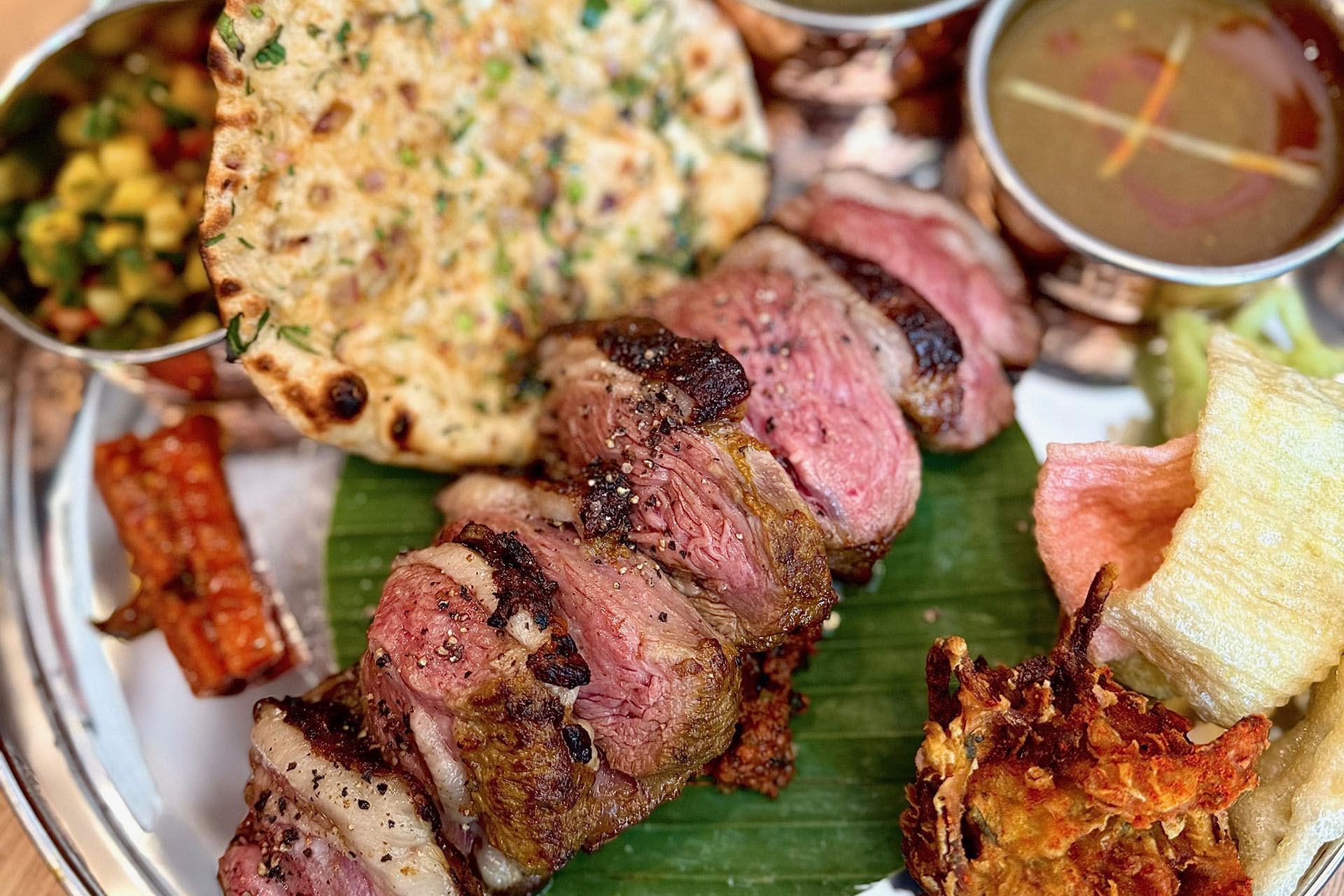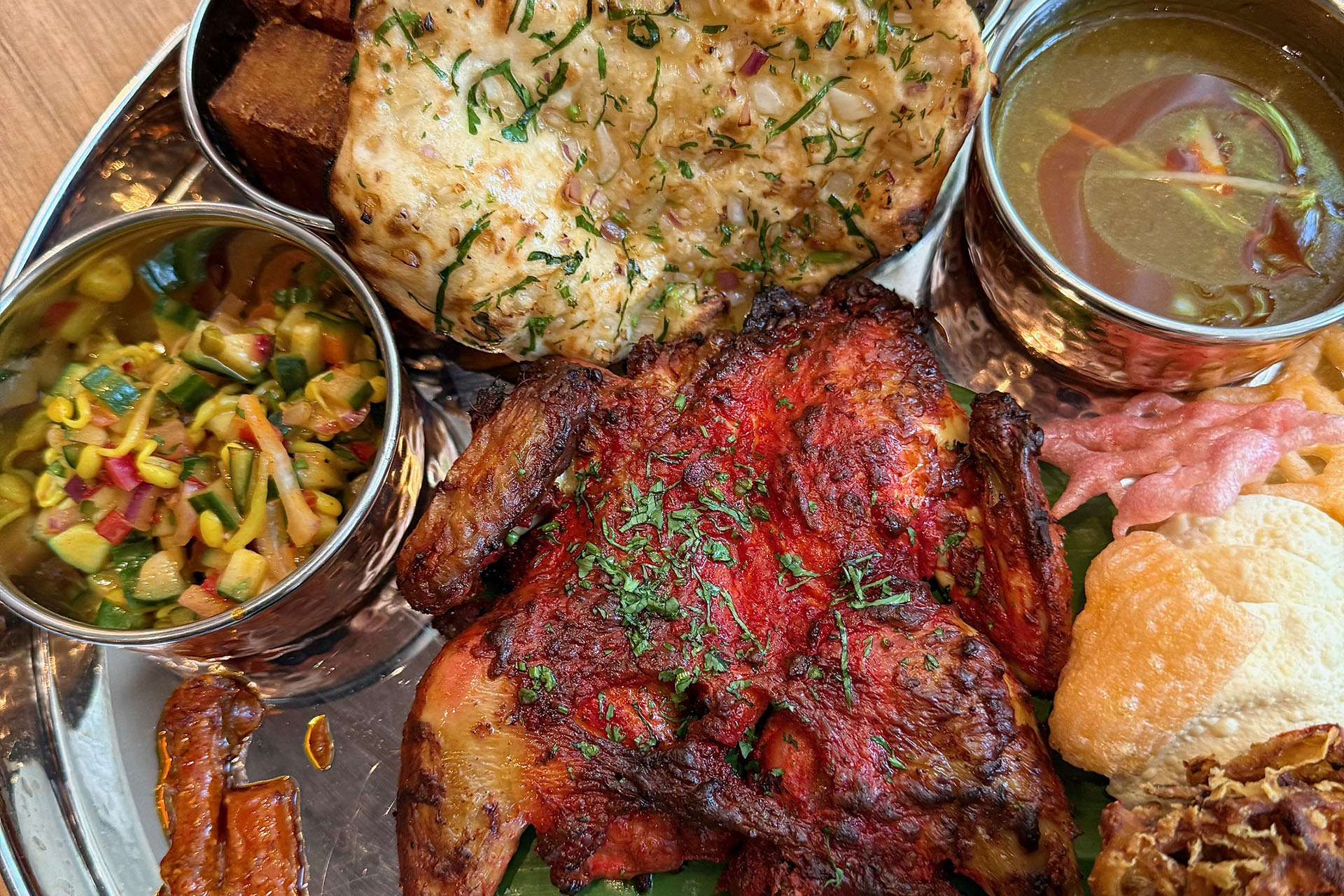 A gleaming silver platter filled with an assortment of small dishes is presented, bringing with it a heavenly aroma of fragrant spices. Front and centre, the fire-grilled Butterfly Spatchcock, pleasingly charred with the vibrant red hue of the spiced yoghurt marinade. It’s a conundrum of choice: just where to start? The chicken is beautifully moist, and the skin crisp and flavoursome from the marinade. You instantly want to pair each bite with one of the various side dishes. The chicken is especially moreish wrapped in the naan with a good helping of crunchy house salad.